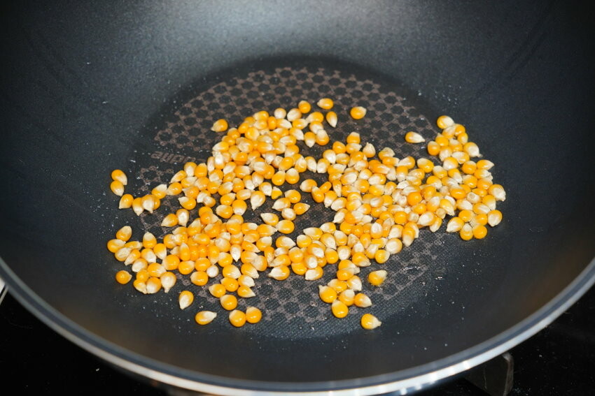 1.平底鍋放少許油,將爆米花玉米粒放進鍋中開小火,邊加熱邊搖晃鍋子。