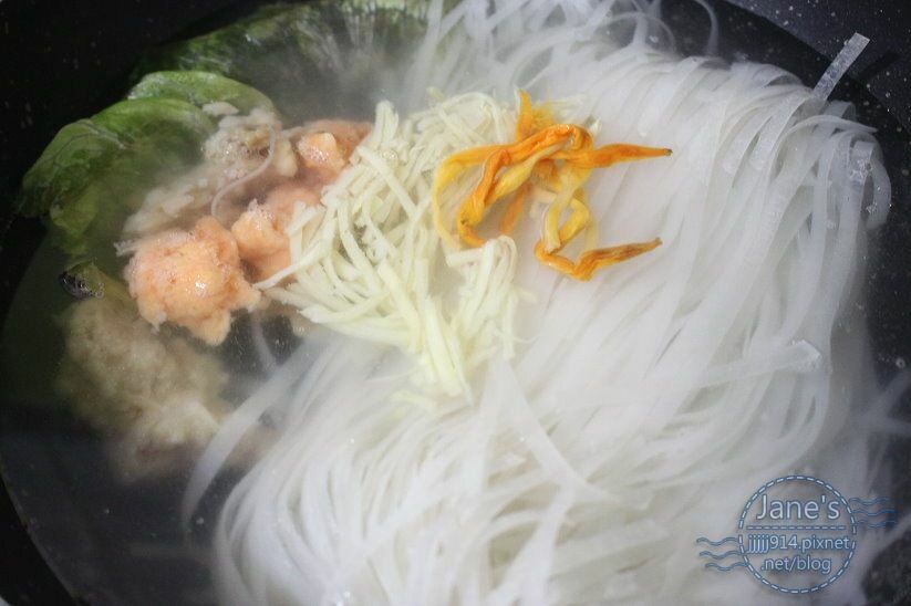 再加入配料一起汆燙之後,加入醬料拌勻入味就可以了,