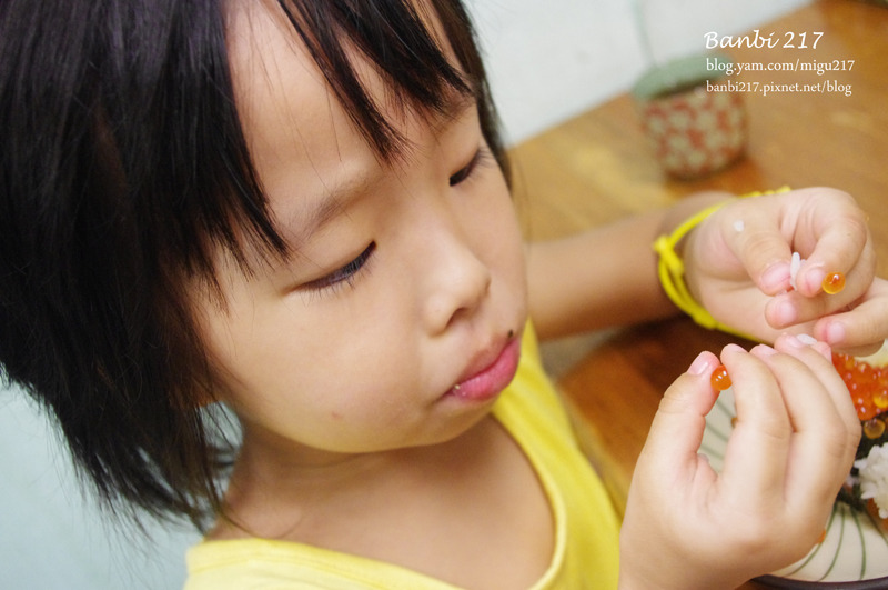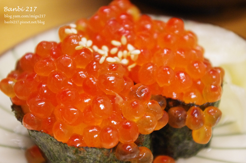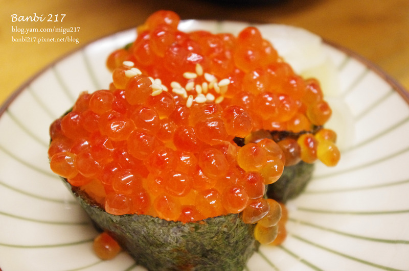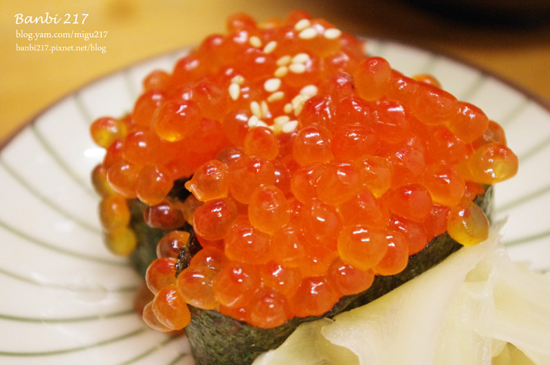 為了我家那愛吃鮭魚卵的蕾蕾點的鮭魚子壽司,因為壽司還滿大的且鮭魚爆滿出來的樣子,送上桌時她開心的歡呼!