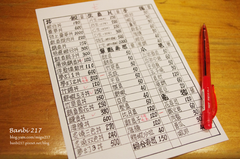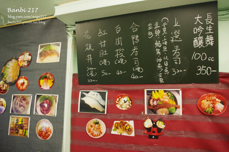 牆上放著一張張生魚片與丼飯、壽司、手卷的照片,也和之前網路別人分享各個丼飯照片旁有附註菜名的有所不同了。