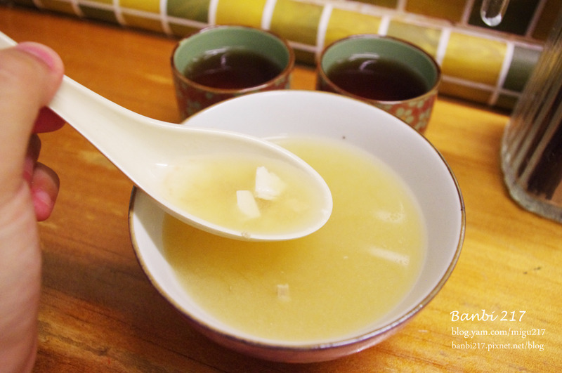 甜甜的味噌湯內有少許的碎鮭魚肉和豆腐。