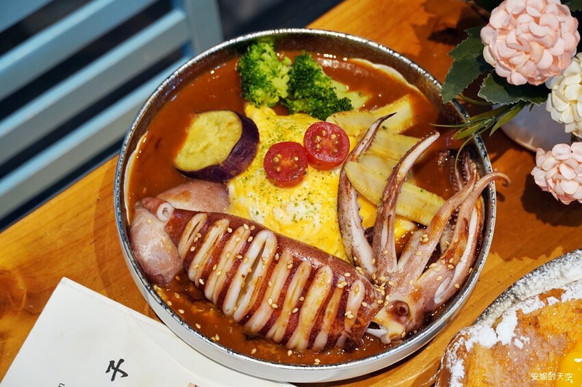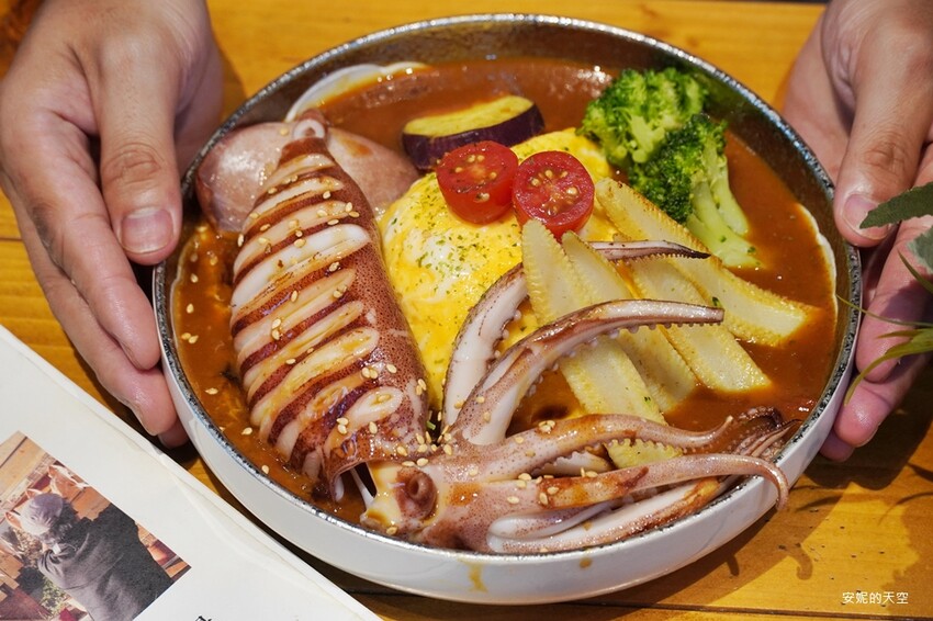 一整隻香煎魷魚豪邁地舖在盤中,金黃蛋包包裹著白飯,濃郁的咖哩香氣撲鼻,搭配各色蔬菜,荷亞的咖哩飯超乎我預期的好吃。