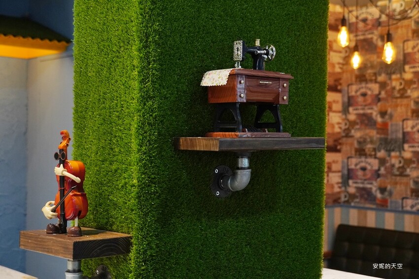 「荷亞輕食館」餐廳裝潢很有溫度,鄉村風的壁貼搭配工業風情的垂墜燈泡,這個角落也太美了,沙發區是聚餐的熱門座位,不限時的空間很值得在這裡賴上一下午。