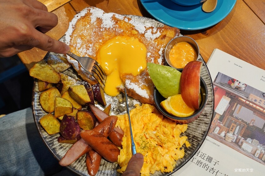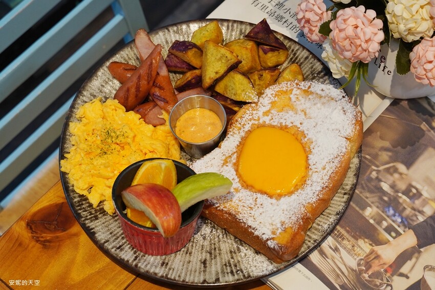 楓糖布丁吐司、炒嫩蛋、德式香腸、水果碗加上栗地瓜,一整盤的豐盛讓人食指大動呢。