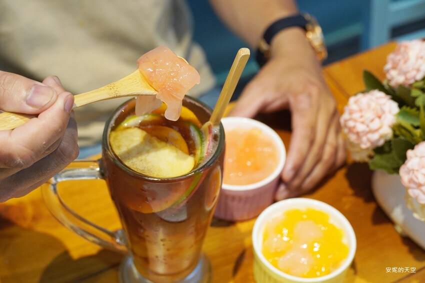 很少有早午餐店家會這樣講究飲料的,茶的基底選用紅玉紅茶搭配水果片,多了水果清香,茶味也不會那樣單調,而且為了讓飲料更有口感,裡面還加了四種風味的粉粿,全都用天然食材材自製,滿口的水果香甜盡在咀嚼中,飲料也是讓人驚豔。