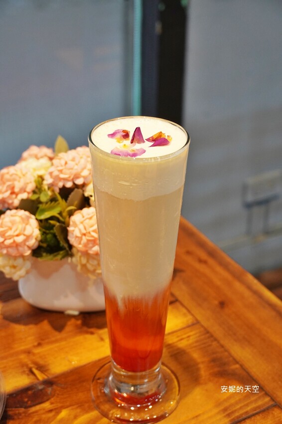 覆蓋一層柔白奶蓋的玫瑰白雪色澤好美,以青茶為基底,覆蓋上鹹香奶蓋,灑上食用花瓣,讓人視覺與味覺都陶醉的玫瑰白雪,也是我超推薦的飲品。