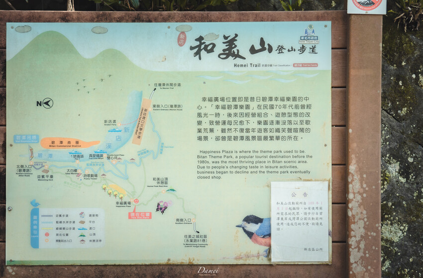 幸福碧潭樂園猜想是許多老新店人的回憶,幸福廣場的位置是過去樂園的中心點,可惜因經營不善最後面臨收攤的情況,步道入口還保留過去樂園的招牌,雖然僅存兩字,似乎也告訴人們它曾存在過。