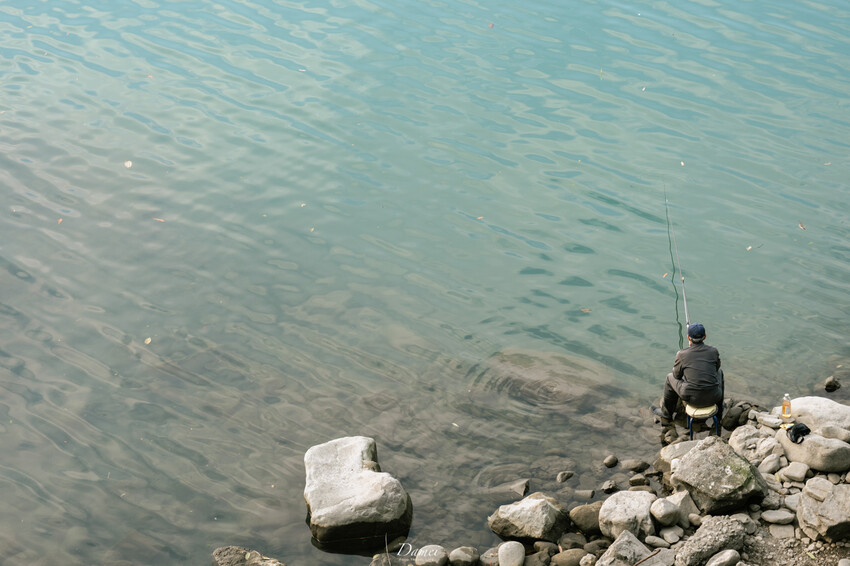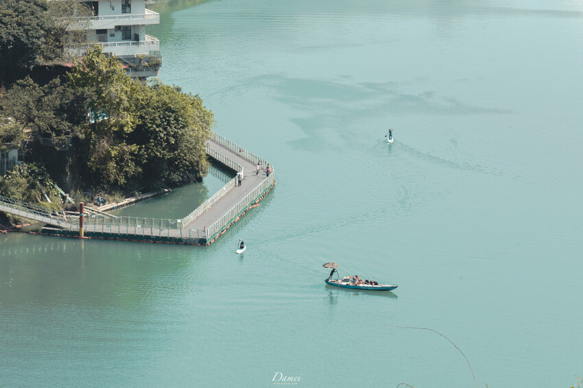 「古老的渡船 辛勞的擺渡人 綠波盪漾在滿山清翠之間 何等逍遙自在」擺渡人自簡易碼頭划船過來接船客,赫然間我被感動了,在水面上顯得更加矚目,從未體驗過的我,看著擺渡人用力地滑著船槳,是那樣敬佩著!而目前僅有一艘船行駛,因此必須多點耐心等待船隻到來。