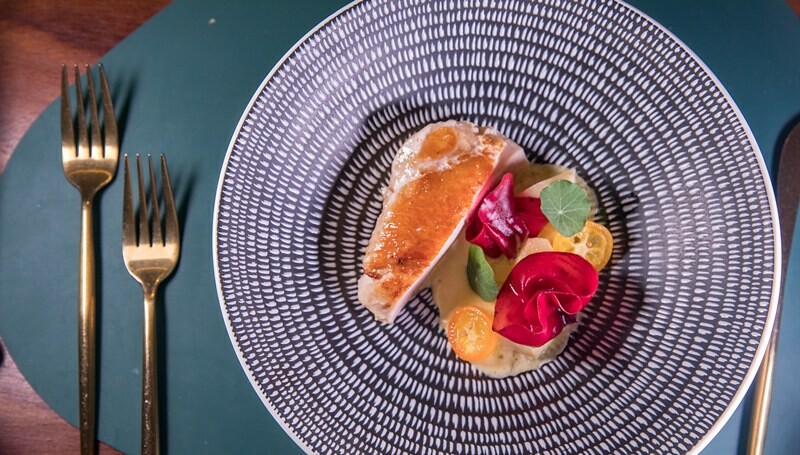 主菜有桂丁雞、熟成鴨、龍膽石斑、橫隔膜牛排四種,我們選了桂丁雞、熟成鴨及橫隔膜牛排,這餐盤非常美,讓我想起日本大分日田的小鹿田燒,那藍白相間的飛び鉋和料理有著和諧的美感,還沒嚐就覺得美侖美奐。