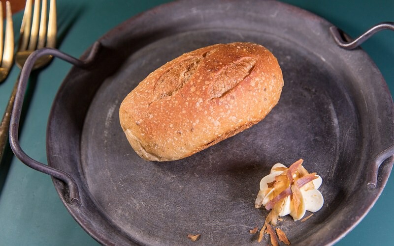 黑麥蜂蜜奇亞子軟法/鳳梨乾/發酵鳳梨/柴魚/發酵奶油,像黑鐵鍋的盤子趁得簡單的餐前麵包閃閃發亮。