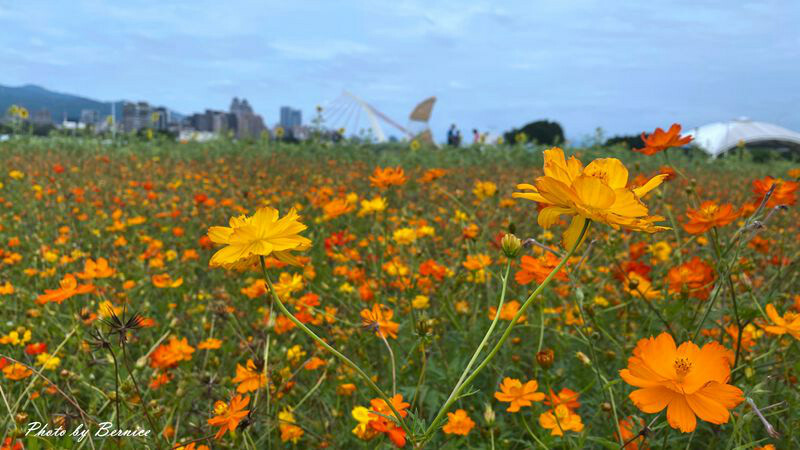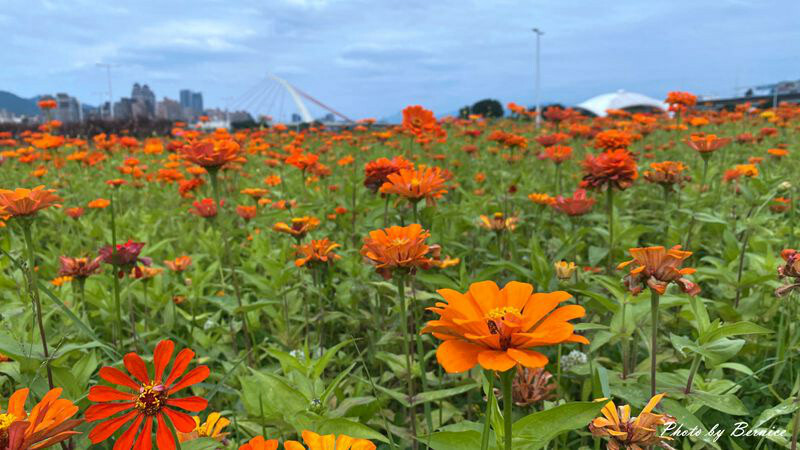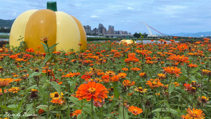 河濱公園花海是近年最親民的賞花點,大佳河濱公園今年的花海範圍相較於往年面積來得更大;百日草、黃波斯菊、紫背狼尾草再搭配巨大南瓜與大直橋,此處被妝點的很多彩