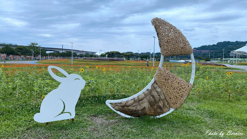 今年的花海範圍約從八號水門到九號水門區段,除了百日草、黃波斯菊、紫背狼尾草外還有三顆巨大南瓜穿梭於花海中;在小小向日葵區還有玉兔與月亮可以一起合影,說來今年的花海與往年相比認真很多,感覺花兒也有在維護而不是任其隨意生長,範圍也擴大,種類也比較多,還有巨大拍照造景