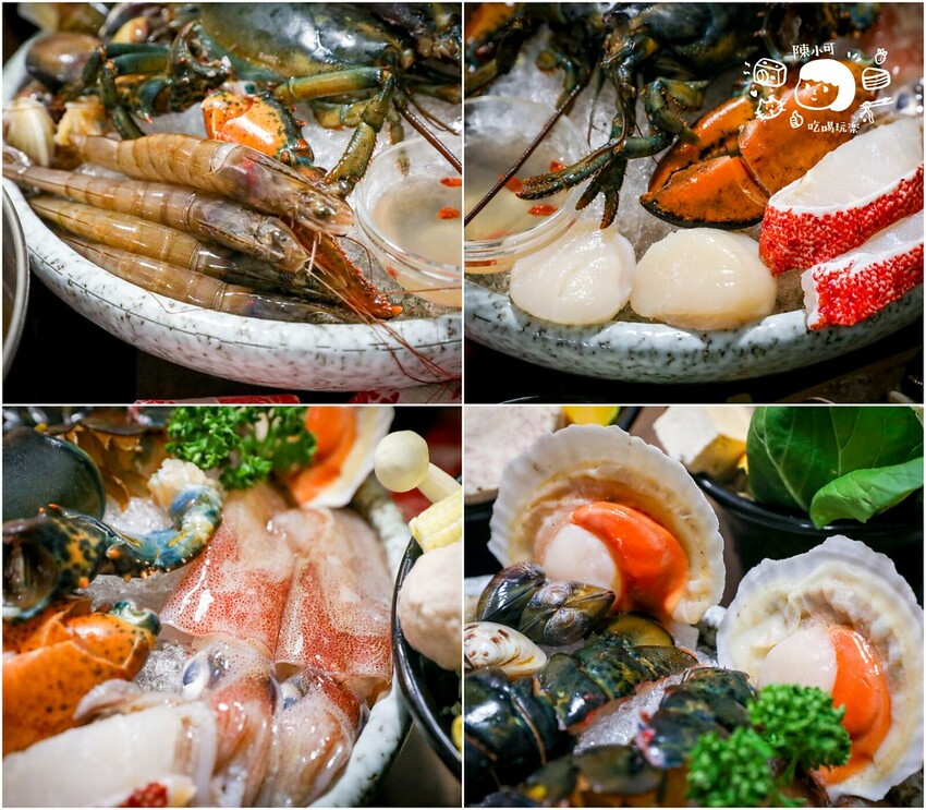就像聚寶盆一樣的海鮮拼盤,裡面有活波士頓龍蝦(一斤)、生食干貝、蛤蠣、扇貝、小卷、石斑魚和海蝦,一小碟裝的是龍蝦血+米酒,可以倒入湯底增加風味。