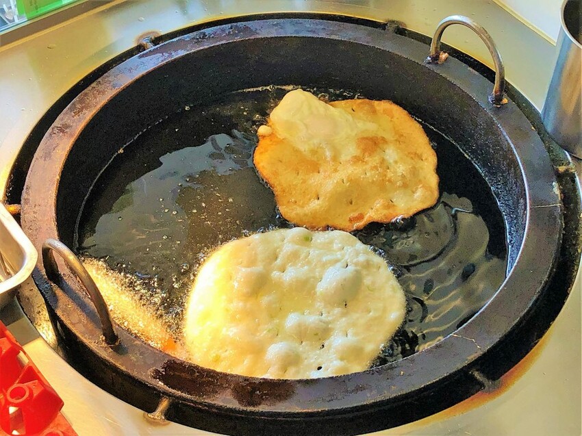 看著老闆一一將麵團擀平,為了均勻受熱而將餅皮打洞,接著放入油鍋油炸,白色的餅皮漸漸被炸成金黃色,接著打入一顆水洗雞蛋並附上餅皮,酥脆的餅皮就能撈起囉!