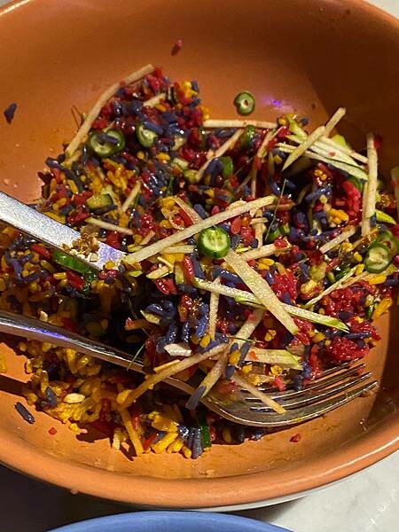 和火龍果、薑黃和蝶豆花染色的飯拌勻