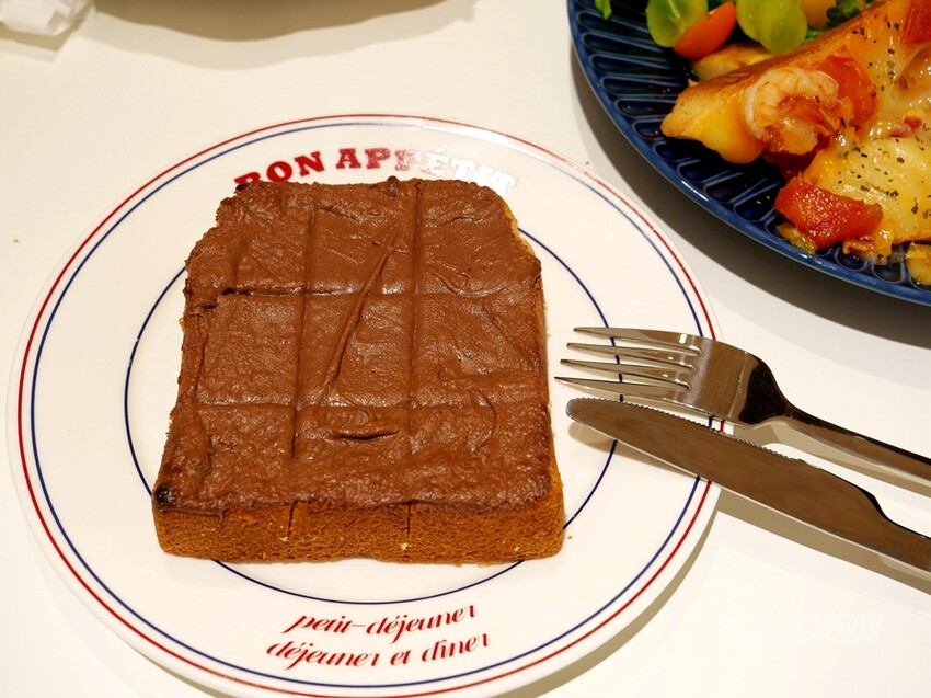 經提醒後立即上桌,看得出來厚片邊緣香酥、抹醬挺厚,很合孩童胃口。