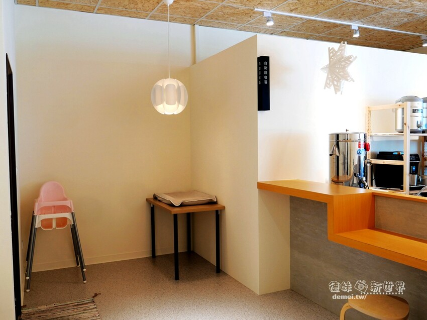 洗手間前的角落擺有兒童座椅與貼心尿布台,另櫃台旁設有自助餐盤回收區。