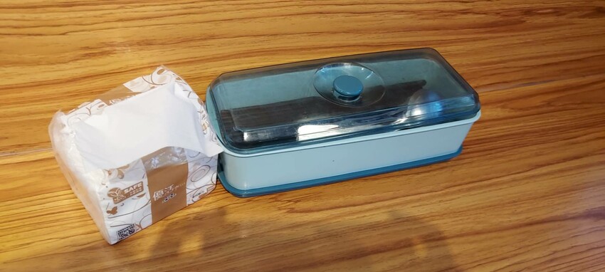 每個座位前方都有個餐具盒及面紙供客人使用。