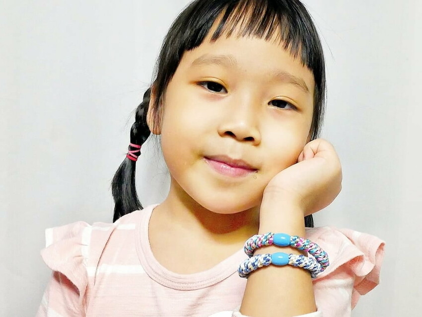 目前五歲的小卉寶貝.髮量算少.第一次使用韓系時尚髮圈替她編織髮辮時. 以為會一直鬆脫掉落. 想不到意外的可以牢牢抓緊.且綁上後看上去很有氣質