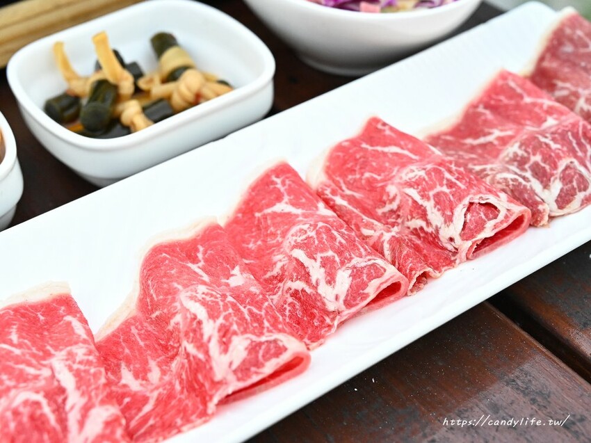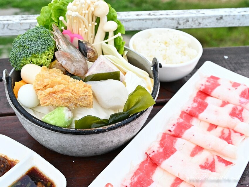 星星複合式夜景餐廳的小火鍋裡頭配料還蠻豐富,生菜、菇類、火鍋料、蝦子、蛤蜊等超過10多種食材,肉品糖糖選的是雪花肉,油花比較豐富,軟質也相當軟嫩呢