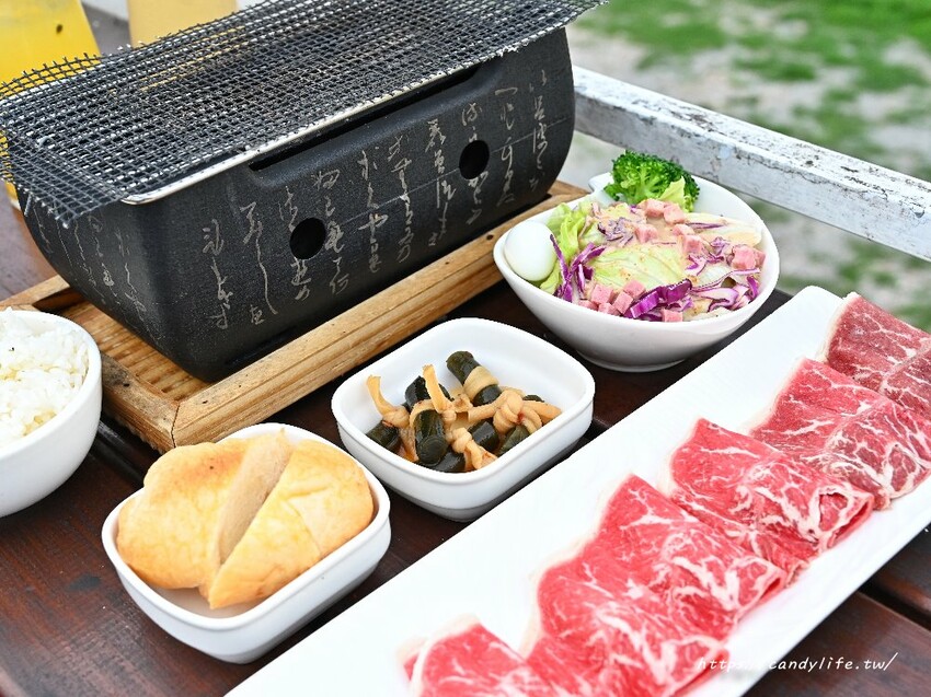 沒想到在夜景餐廳也可以吃到精緻的日式燒肉吧~星星複合式夜景餐廳除了熱呼呼的火鍋外,還有提供單人日式碳烤燒肉可以選擇,糖糖主餐選的是沙朗牛,裡頭除了肉品,還有附上麵包、小菜、沙拉及白飯