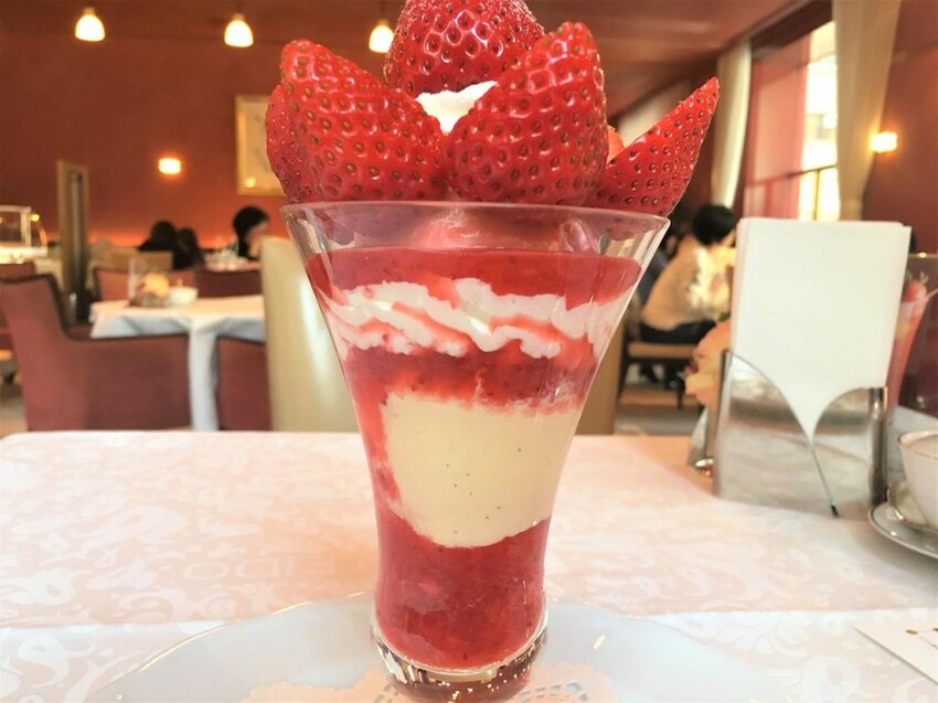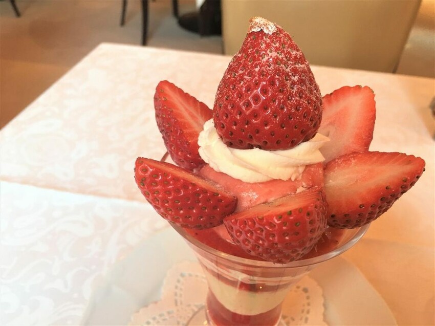 這裡的甜點菜單多樣,除了聖代,還有蛋糕、法式吐司等。剛好在1月辦草莓活動,把原來的1730日幣的草莓聖代升級,換成精選的草莓品種(香川產さぬきひめ/福岡產四星),售價是1890日幣。最高級的岐阜產美濃娘草莓聖代更是3240日幣!!你還可加570日幣配一杯紅茶或咖啡。