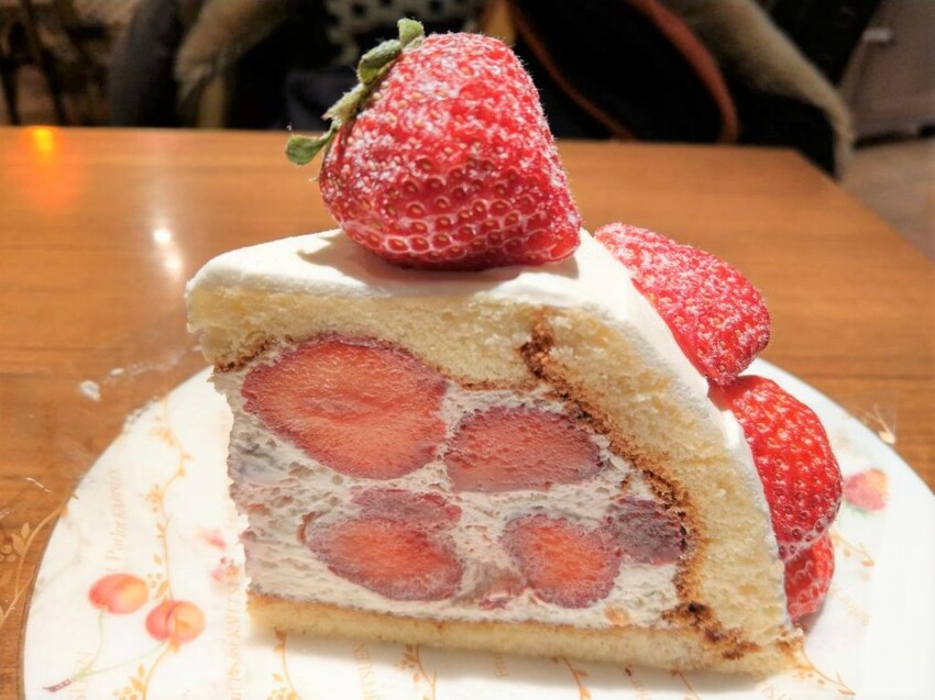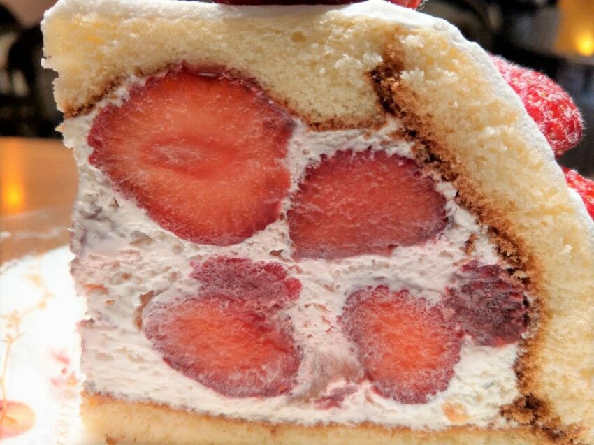 而這裡的草莓蛋糕是採用意大利圓頂蛋糕方式,在兩片海綿蛋糕中間加入滿滿的鮮奶油及草莓,據說草莓都是每天新鮮進貨,這樣的一片蛋糕就用上15~18顆草莓,超越一般草莓蛋糕的界限!蛋糕與鮮奶油都偏甜一點,但剛好跟微酸的草莓配合,中和起來剛剛好!雖然一塊就要1800日幣比較昂貴,但偶爾奢侈一下,這個蛋糕絕對能滿足你的草莓欲望(笑)