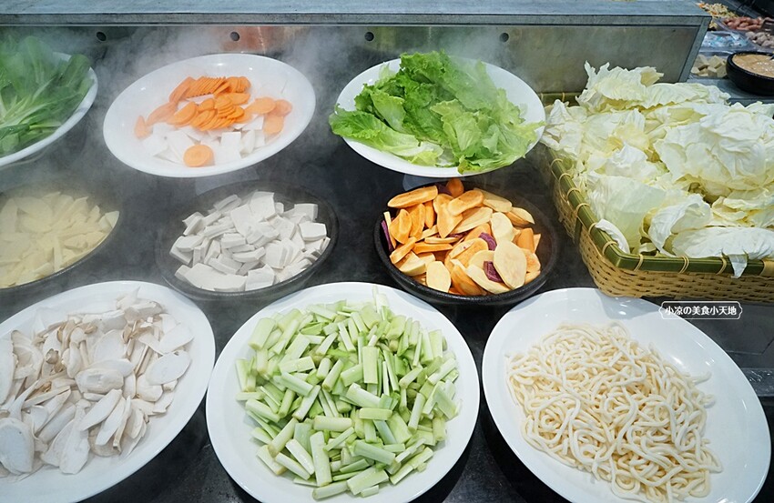 吃火鍋最常見的高麗菜、大陸妹、黃紫地瓜、紅白蘿蔔、杏鮑菇、烏龍麵,這一區比較特別的是有碧玉筍(金針筍),最底下中間那一盤,這在市面上比較少見,很建議大家可以試試那脆嫩的風味唷!!