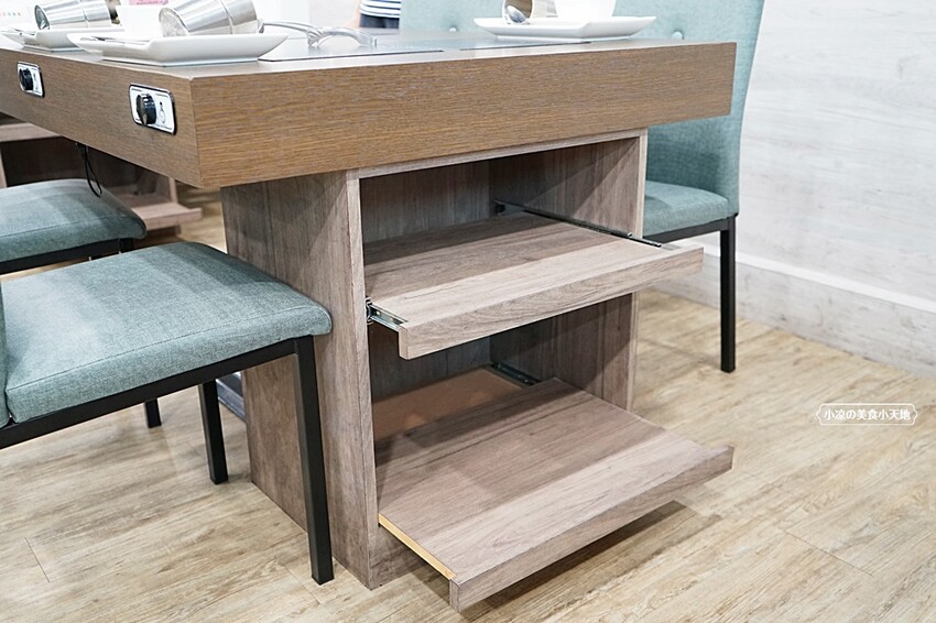 介紹完自助百匯後,就要來進入主題囉!但小凉還是要來說下鬥牛士二鍋貼心設計,每一桌側面還有拉取式抽屜,如果桌面上擺不下食材、就可以把東西放在抽屜這,但千萬記得要拿上來吃、不要遺忘了唷!