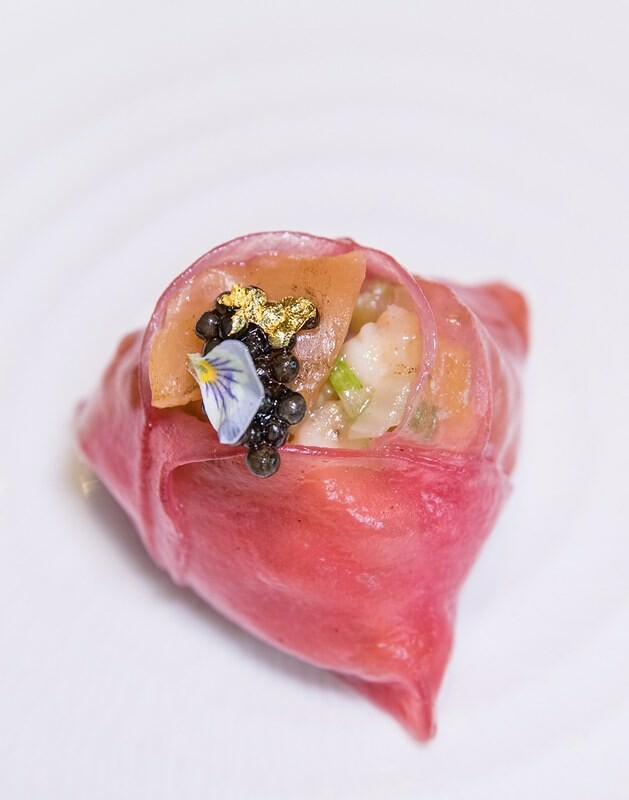 貝禮紅裳花膠椎美的不像話,真的活像穿了件紅裳的港點,除了特別以甜菜根入餃皮外,還少見把粵菜熬湯的花膠和花枝、鮮蝦漿為餡,再佐以法國魚子醬、金箔添色增味,光看就讓人賞心悅目。以花膠取代鮑魚,雖然少了爽脆卻多了溫柔的化口,鮮彈微爆汁的花枝蝦漿咀嚼間迎來微微的高湯花膠甜,魚子醬正好補充了少許的鮮鹹,真是一款足以代表春天的全新港點。