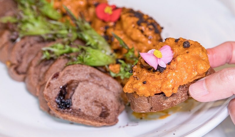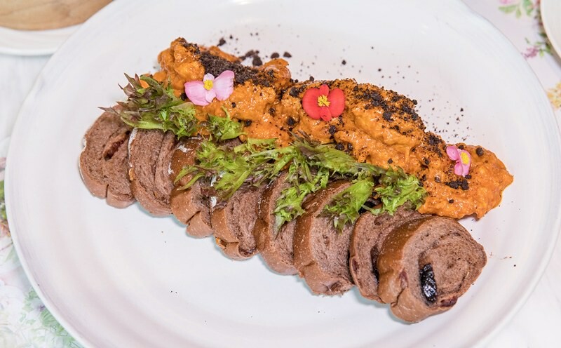 泰皇咖哩軟殼蝦,這道略帶南洋風的料理,開場讓人摸不清是何路數,軟殼蝦蟹和泰式咖哩自是不算少見的搭配,但注入鹹鴨蛋的巧思便多了一個檔次的鹹香,微辣的紅咖哩和連殼一起炸的蝦子單吃便有風有味,搭配加了巧克力的軟法、生菜吃法別有一番滋味,尤其是咀嚼端的味覺驚喜(巧克力),是頗為大膽的味覺嚐試。