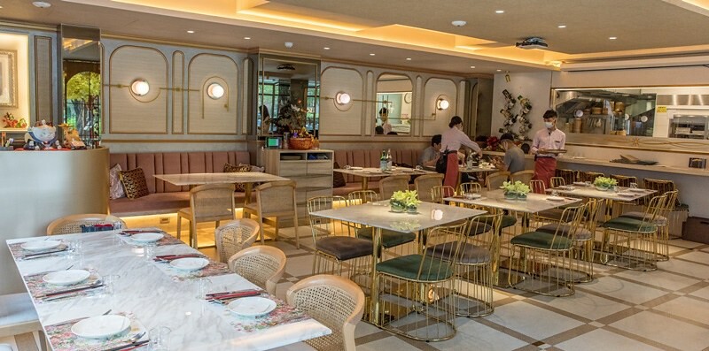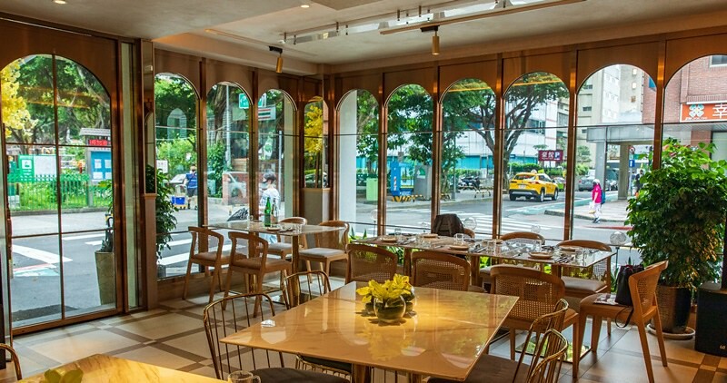 一樓方正空間一如外觀有著飯店餐廳的氛圍,大片落地窗正對著伊通公園的綠意。