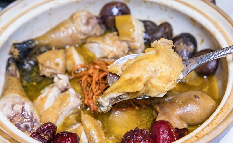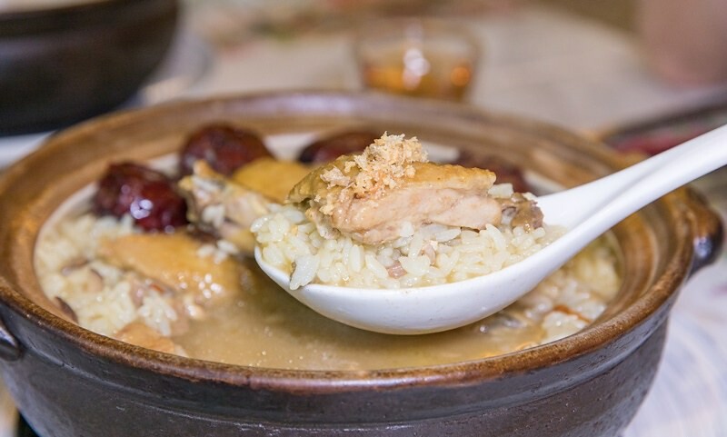 加入雞骨架、雞汁煮成雞肉泡飯,那湯更是鮮甜得亂七八糟,連著台梗16號的泡飯一起吃,飽嘴到讓人一口接一口,順便一提的是那超大吸湯的紅棗千萬別錯過,將之泡在雞湯再吃同樣美味的讓人驚喜。