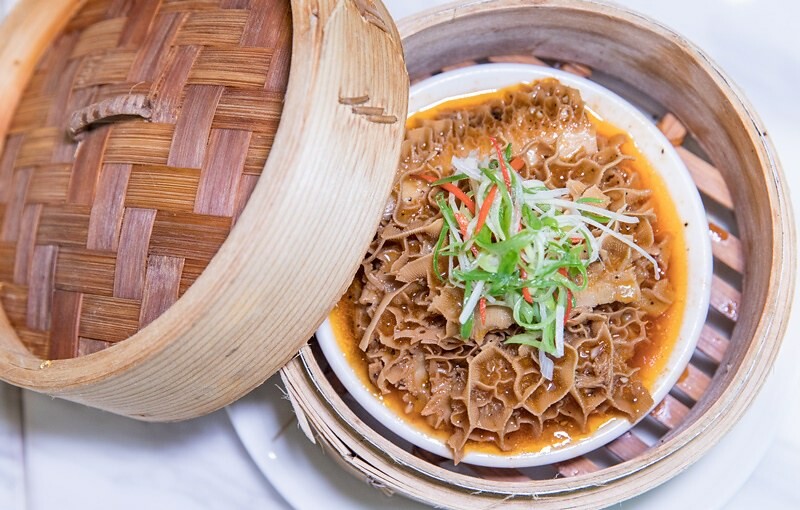 粵式黑椒金錢牛肚,牛肚也是港點常見的前蒸籠點心之一,玖伊特別之處在於入口是濃淡合宜的鹹香油辣,卻又混著黑胡椒和淡淡的酒香,百頁狀的牛肚吸滿蒸出的油香湯汁,飽嘴滿足微香微辣開胃十足。