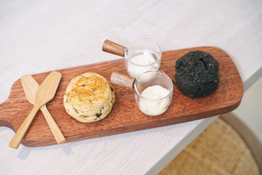 個人蠻推薦映日的司康,完全不乾口,「橙香葡萄乾司康」最能呈現出司康的原味,沾上鹹香乳絡醬或是帶有牛奶糖香氣的奶油凝乳都很適合。