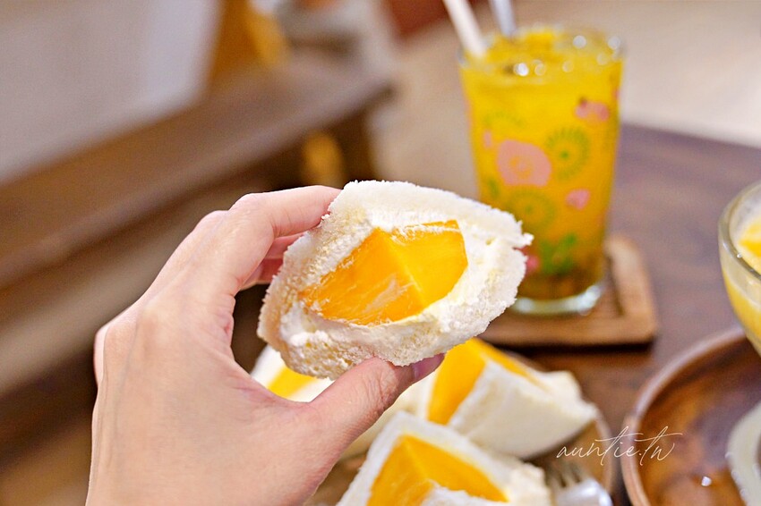 猛然一看還以為包的是蛋黃咧😂 !通常吃到的水果三明治中間的水果都切的比較小、比較細,不過他們家的是整塊芒果加生乳夾進吐司中,香甜不膩口,生乳奶油的口感沒那麼細緻,可能芒果大大塊,哈哈,比較感覺不到生乳的存在,不過吐司口感很柔軟,味道不差啦,雖然目前的愛文芒果還不到正甜的時候,不過整體來說還算不錯。