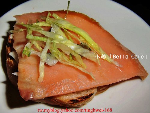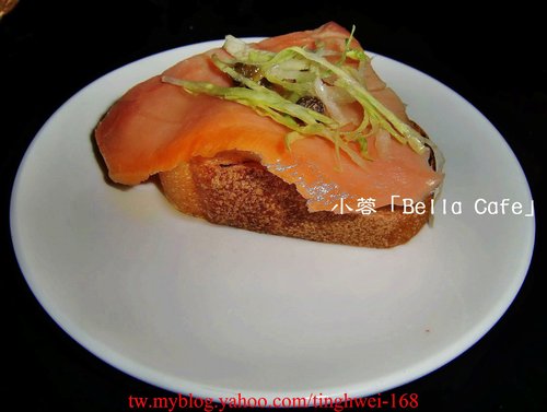 鮭魚片口感鹹香滑嫩搭配下面抹了橄欖油的麵包一起吃味道還不錯~