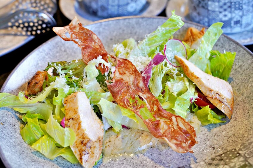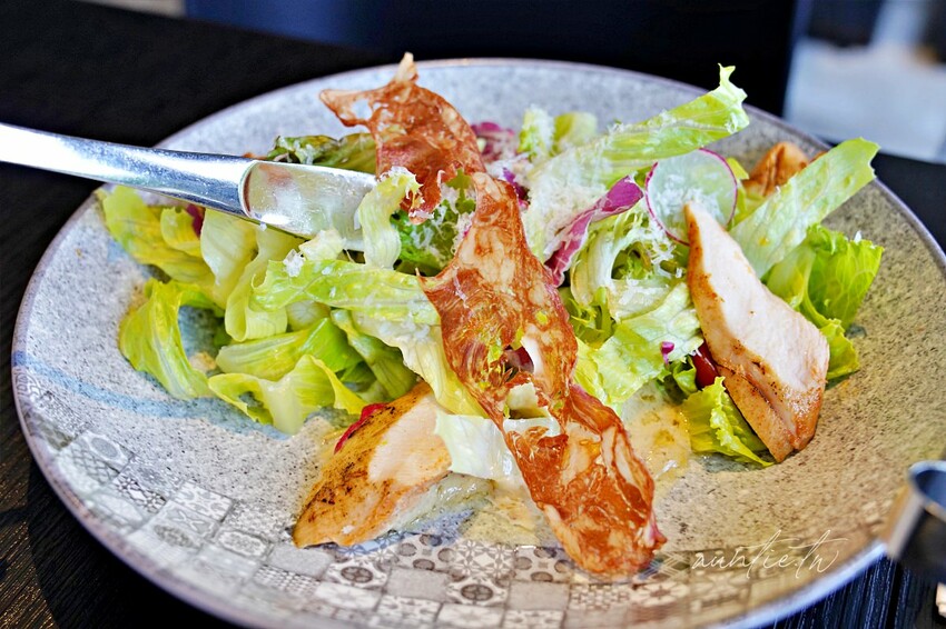 鮮翠萵苣葉搭配香濃不膩的凱薩醬,配上帕瑪森乾酪還有脆培根,雖然平常很不愛吃雞胸肉,但是這道的雞胸部分處理得很好,口感柔嫩,吃的時候可以把培根弄的碎碎的拌著沙拉一起吃,鹹香夠味,非常開胃。
