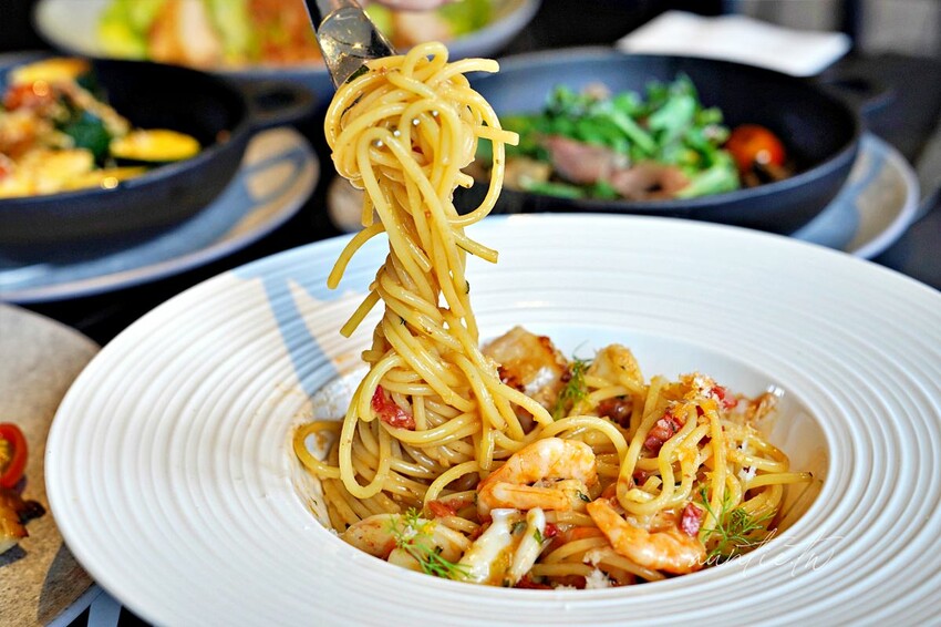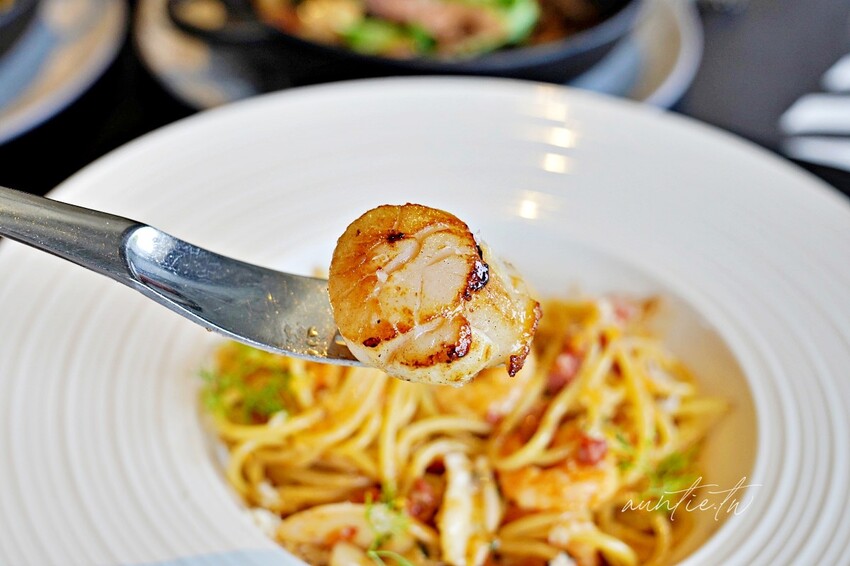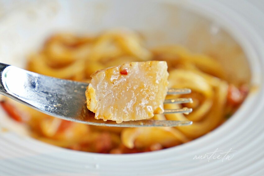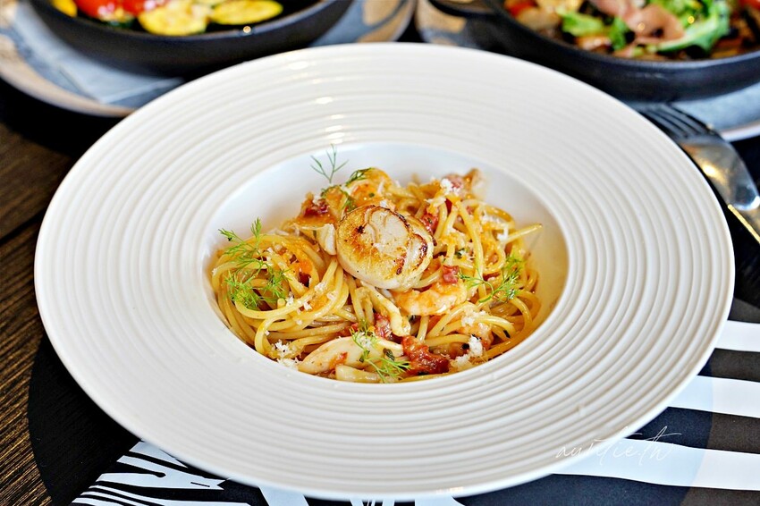 海味滿滿海鮮義大利麵,一上桌眼睛就直盯著大顆的北海道生食級干貝,材料包括了槍烏賊、黑虎蝦、西班牙辣味臘腸、風乾番茄,以蝦蟹高湯拌炒搭配細圓麵。麵體本身吸附了鮮美的海鮮高湯,每一口都有豐富的大海滋味,北海道干貝中間是半生熟的狀態,嫩度剛剛好,黑虎蝦大隻鮮甜,整體來說,美味度100分!