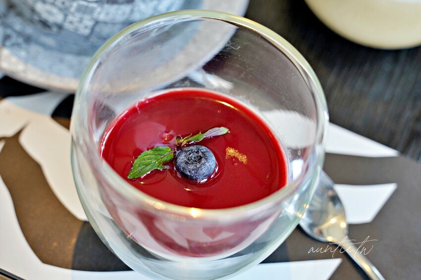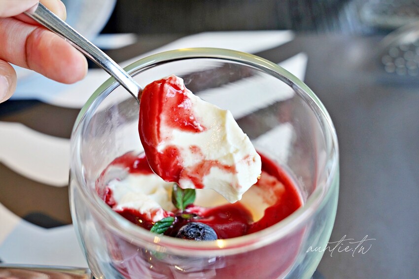 以果產鮮乳製作成的奶酪,搭配莓果醬與新鮮藍莓,是奶香味豐富又不膩口的一道甜點。