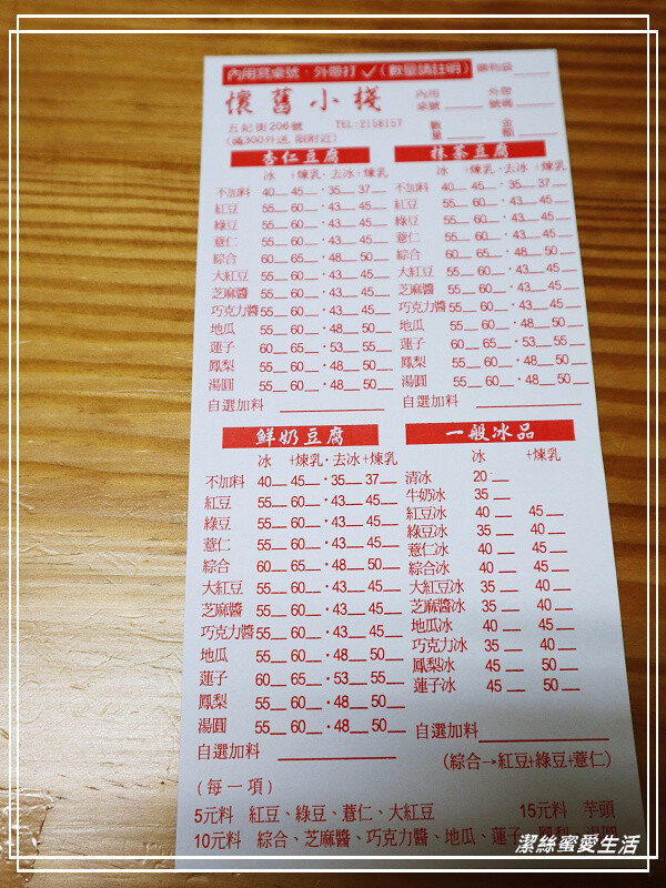 店內主要賣三種豆腐冰:招牌杏仁豆腐/鮮奶豆腐/抹茶豆腐,也有一般冰品,先選口味再選配料,也能自選加料。