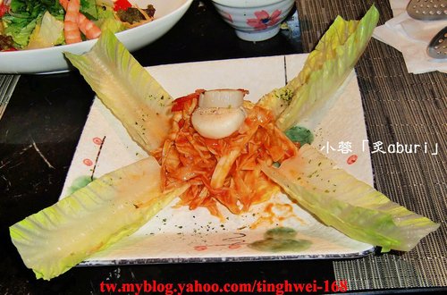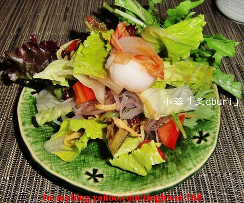 生菜上淋了芒果醬汁 , 香甜的味道有加分作用~
