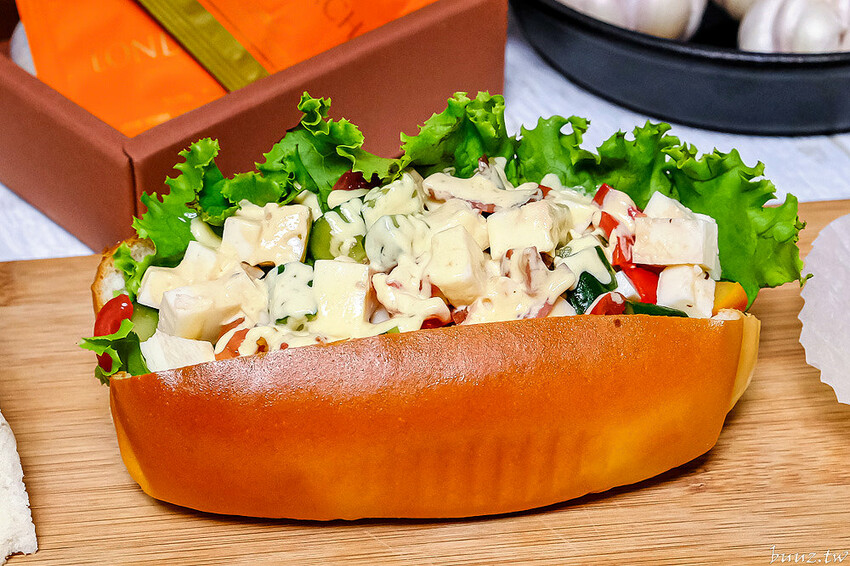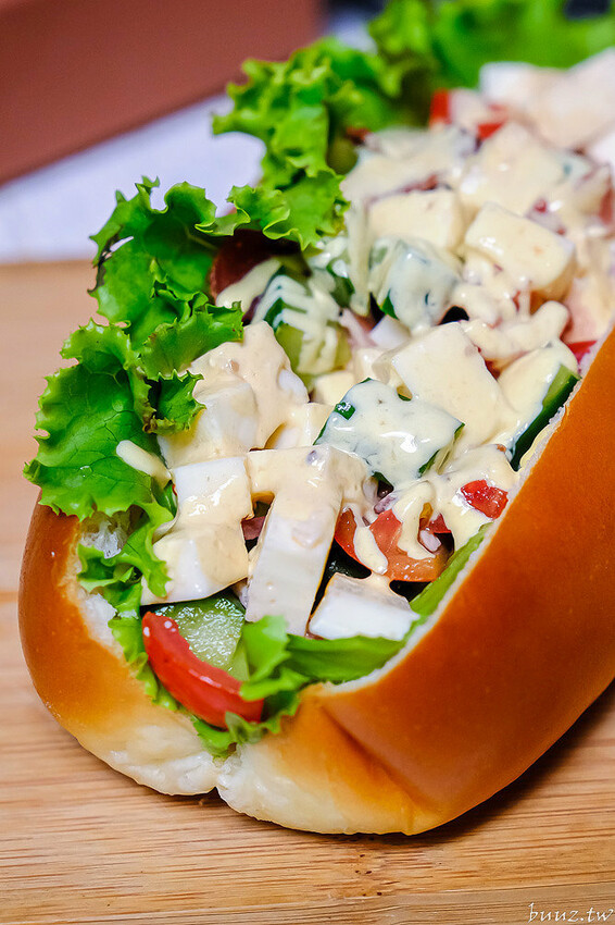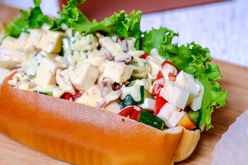 緊接這再來介紹這款仲夏沙拉也很適合炎熱的天氣吃,麵包內加入培根、玉米粒、蛋白丁、小黃瓜、小番茄跟生菜,淋上自製的蜂蜜芥末醬。