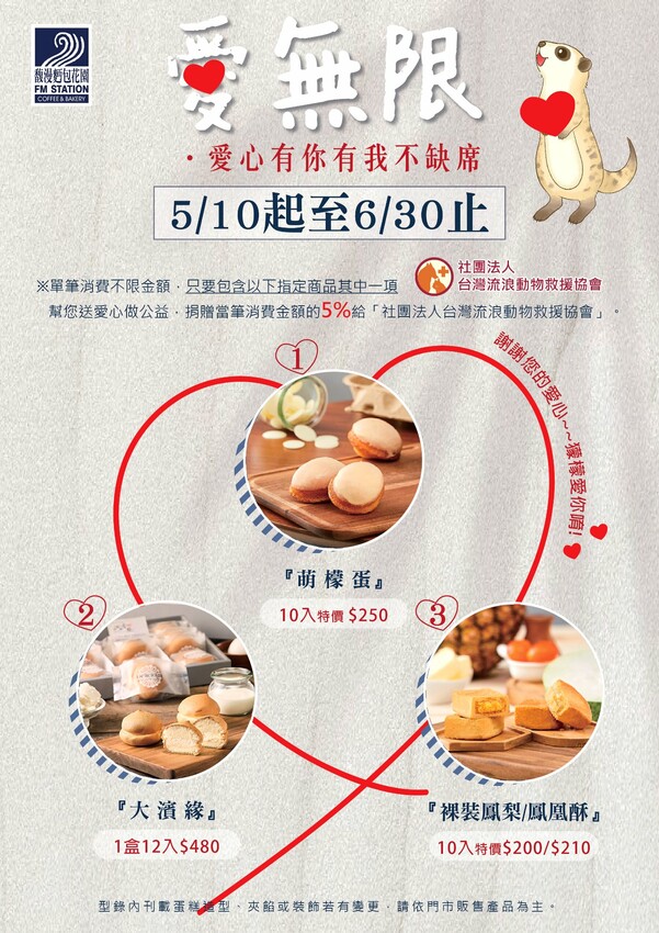 單筆消費不限金額,只要包含萌檬蛋、大濱緣、裸裝鳳梨酥、裸裝鳳凰酥其中一項,幫您送愛心做公益,捐贈當筆消費金額的5%給「社團法人台灣流浪動物救援協會」~(馥漫愛心做公益活動連連:https://bit.ly/fmCharity1)