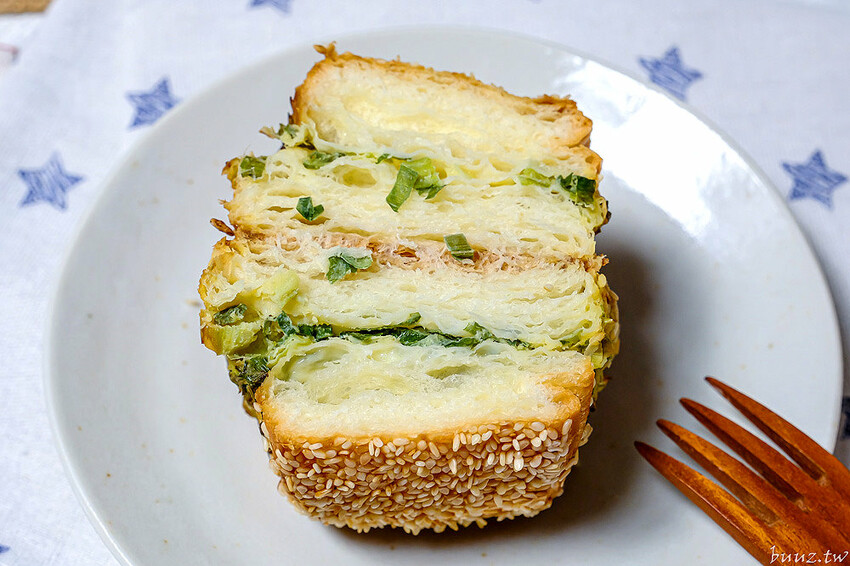 層層麵包咬下去很有咬勁,每一口都有著蔥香氣息,配上芝麻的香氣點綴,越嚼越香,很適合配咖啡或是紅茶。
