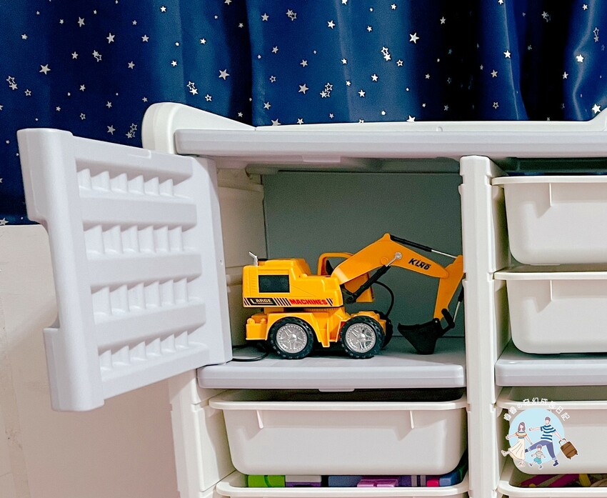 除了收納盒的空間以外,還有一個獨立的空間,外面有一扇門可以開關,平常沒有分類的玩具就可以先放進去,門關起來就看不到很亂了!