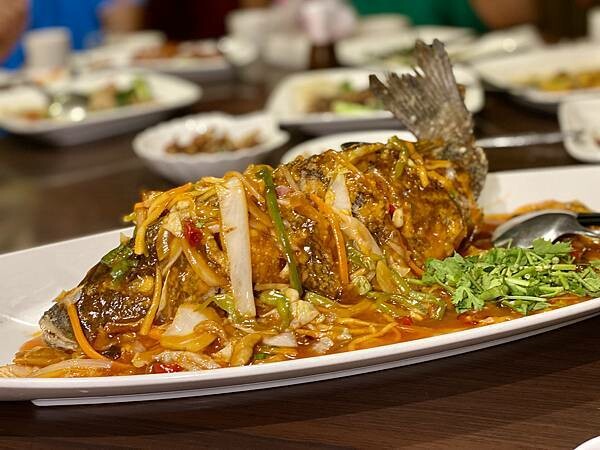 再以五種切成絲的蔬菜燴煮勾芡,淋在魚上,