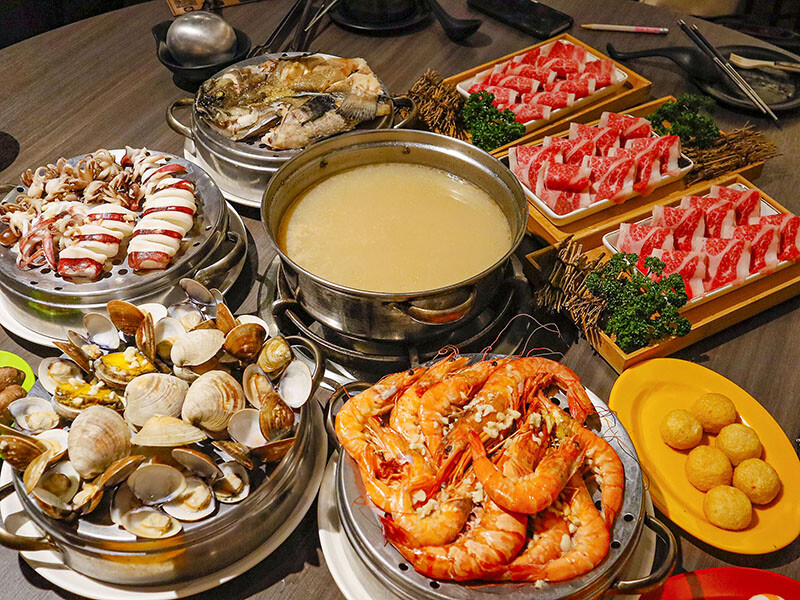 海鮮塔是主體,火鍋也別閒著~快把剛剛拿到的火鍋料先下了吧~吃海鮮喝著濃郁的精華湯頭才對味。