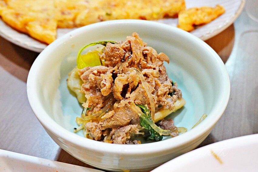 端上來一度以為是在吃熱炒店,烤肉飯就是直接烤好加高麗菜、粉絲在裡頭,搭配小菜跟白飯,烤肉味道偏甜一些,是有點空虛,牛肉有點太熟,口感乾乾。