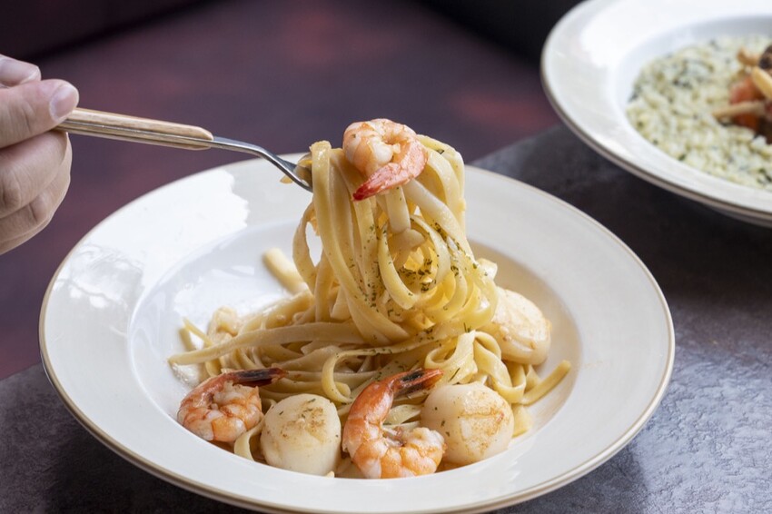 另外,還有義大利麵、糖醋薯片、酥皮濃湯等多元的品項~其中清炒鮮蝦干貝寬扁麵我有很喜歡,麵條吸收了滿滿的醬汁,有著蝦子的鮮甜和辛香料的香氣~麵條口感Q彈有嚼勁,再加上去殼處理的白蝦和香煎的整顆生食及干貝,就是一場完美的美食饗宴!